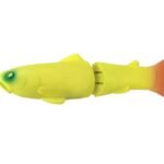 Swimbait mythique, le NEW SLIDE SWIMMER est clairement conçu pour la traque des poissons trophées : brochets, bass, silures, bars font partie de son tableau de chasse. Ce glide bait a été développé pour duper la méfiance des poissons éduqués, sa nage en »S » et sa finition sont d’un réalisme bluffant, les charnières articulées de son corps sont conçues pour ne pas faire de bruit. Son corps est en ABS très résistant et recouvert d’une jupe en silicone souple qui permet de créer effet ressort au niveau de l’articulation conférant à la nageoire un phénomène de propulsion. Ce procédé unique lui procure davantage de fluidité qu’un swimbait articulé classique et une meilleure réponse aux jerks. Le système « micro vibe » placé dans sa tête peut se déclencher lorsque l’on twitch le leurre, créant ainsi des micro-vibrations, même à l’arrêt. Slow sinking, il est possible d’ajouter un lest dans le logement situé sous sa bouche pour le rendre sinking.